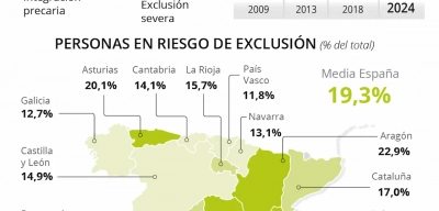 La población en situación de exclusión severa se incrementó en dos décimas hasta el 8,8% y el total de población en situación de exclusión creció un punto hasta alcanzar el 19,3% del total, por lo que podría afirmarse que una de cada cinco personas en España está en riesgo de exclusión