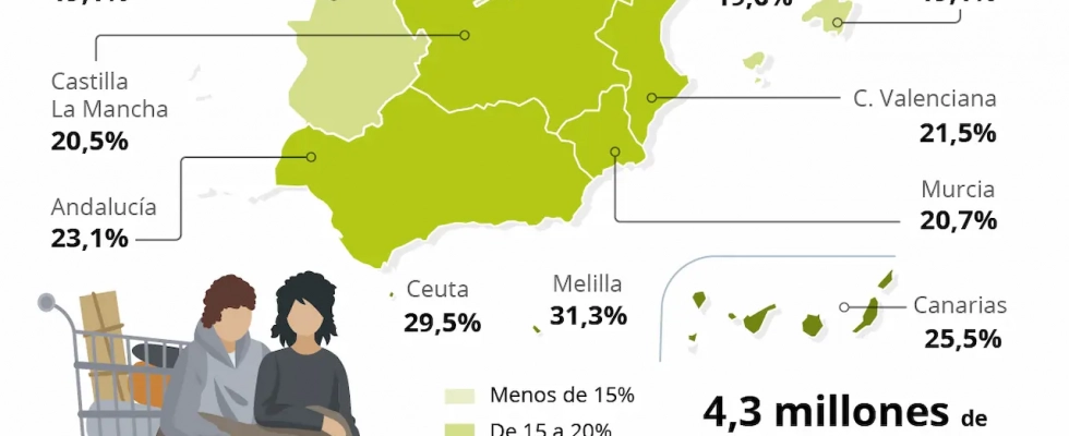 Melilla tiene el 31,3% de su población en riesgo de exclusión y, en Ceuta, el 29,5% de personas se encuentra en la misma situación. También Canarias está por encima del 25% (25,5%) de sus habitantes en riesgo de exclusión